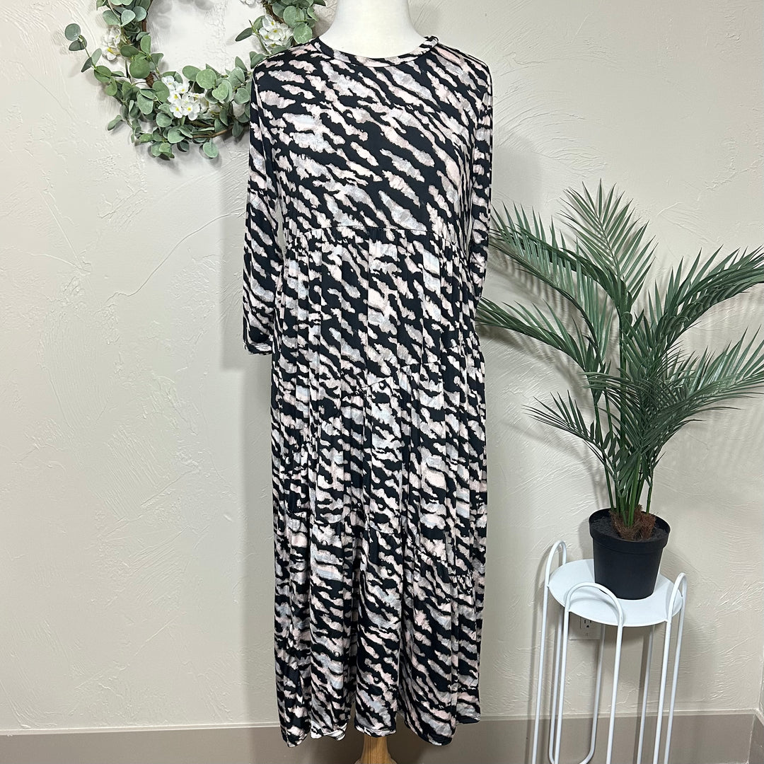 Liza Lou's Camilla Animal Print Flowy Black Pink Long Modest Dress