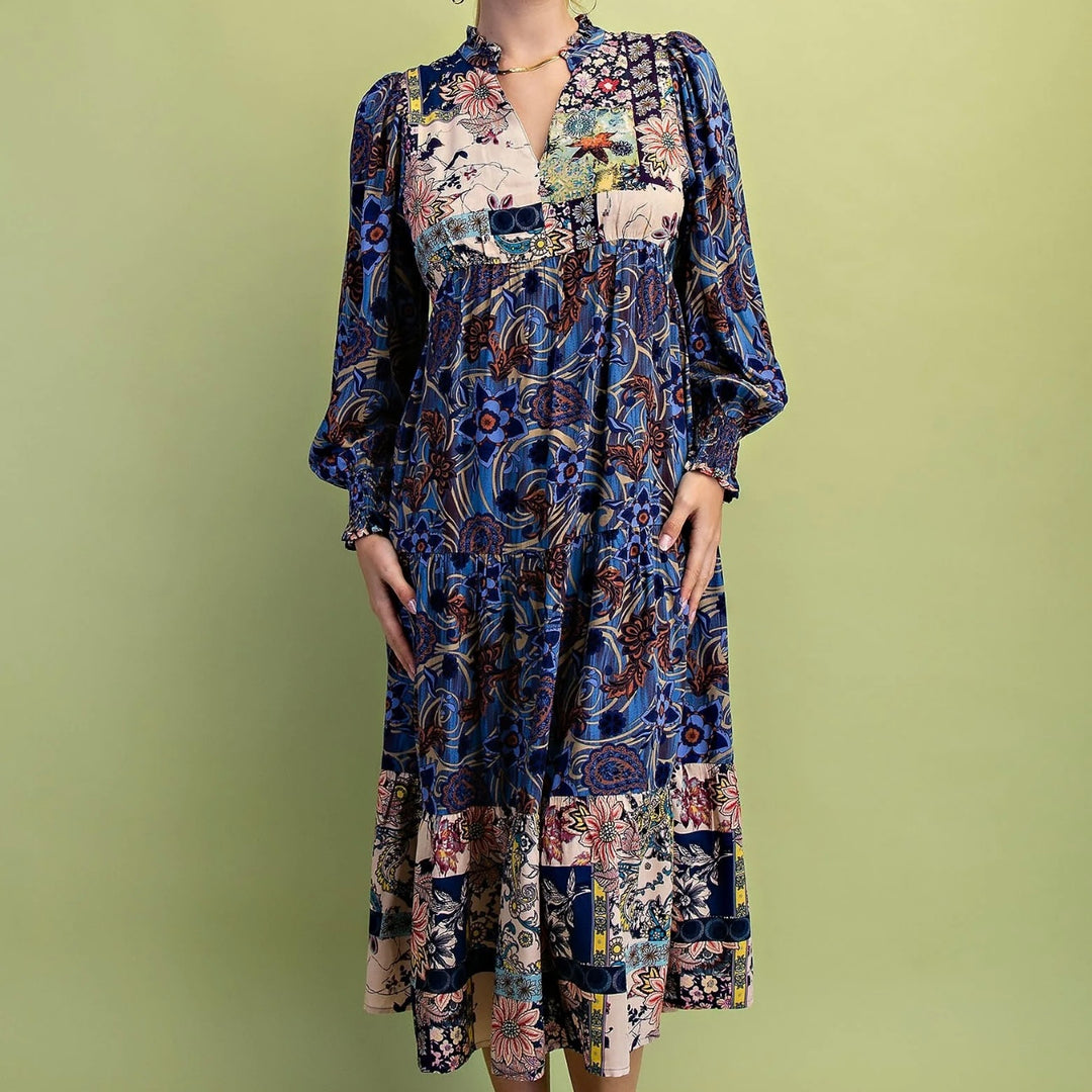 Maddy Blue Navy Floral Tiered Colorful Midi Long Dress Misses & Plus Sizes