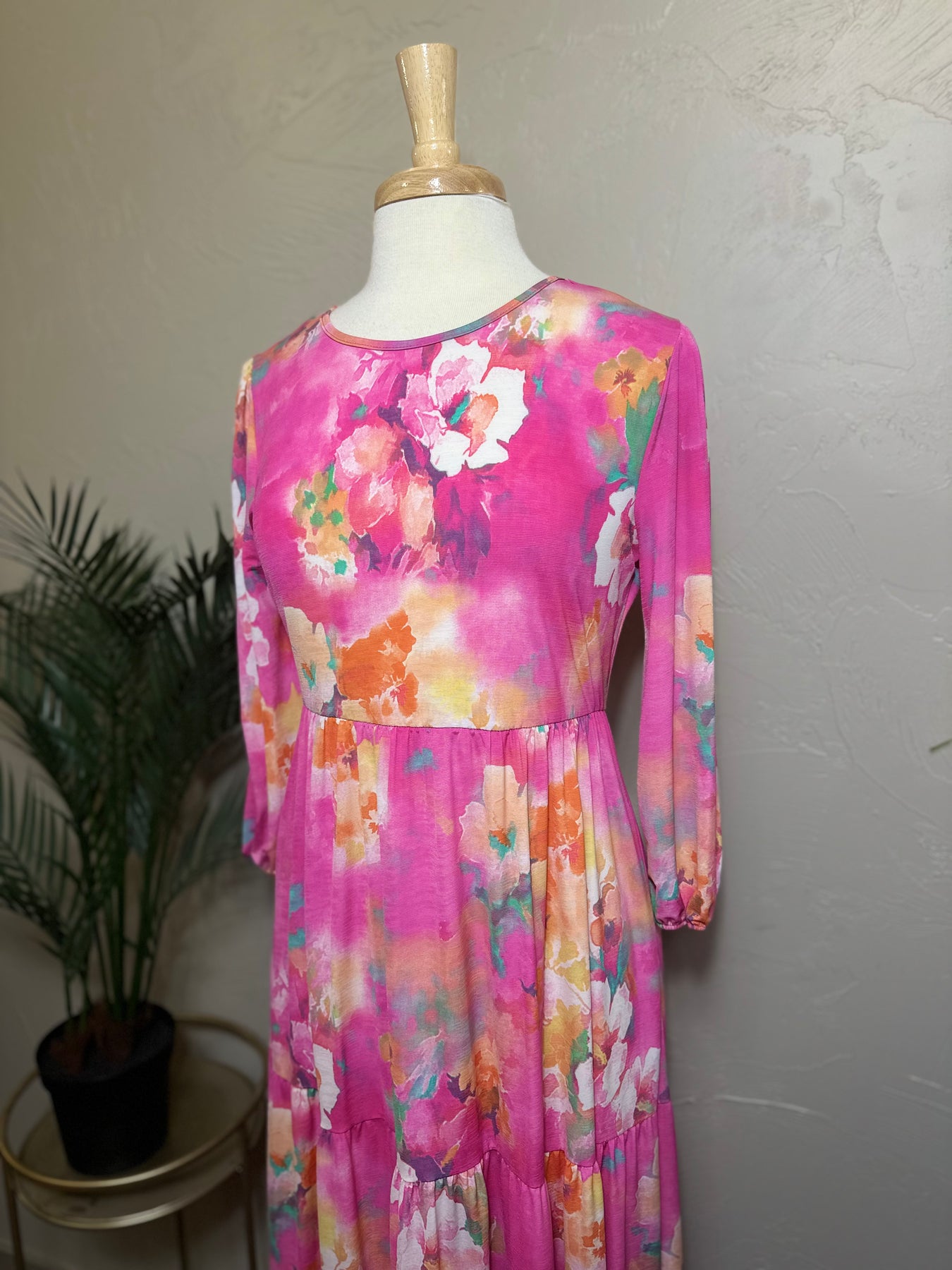 Pink Modest Long Floral Tiered Dress with Elastic Waist