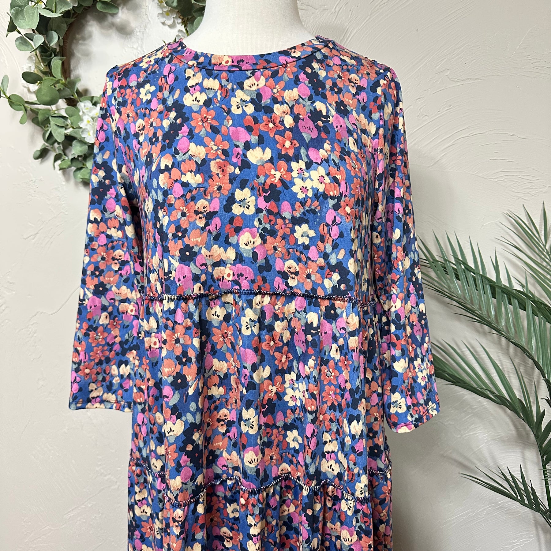 Liza Lou's Vienna Modest Blue Surged Edge Floral Tiered Modest Dress