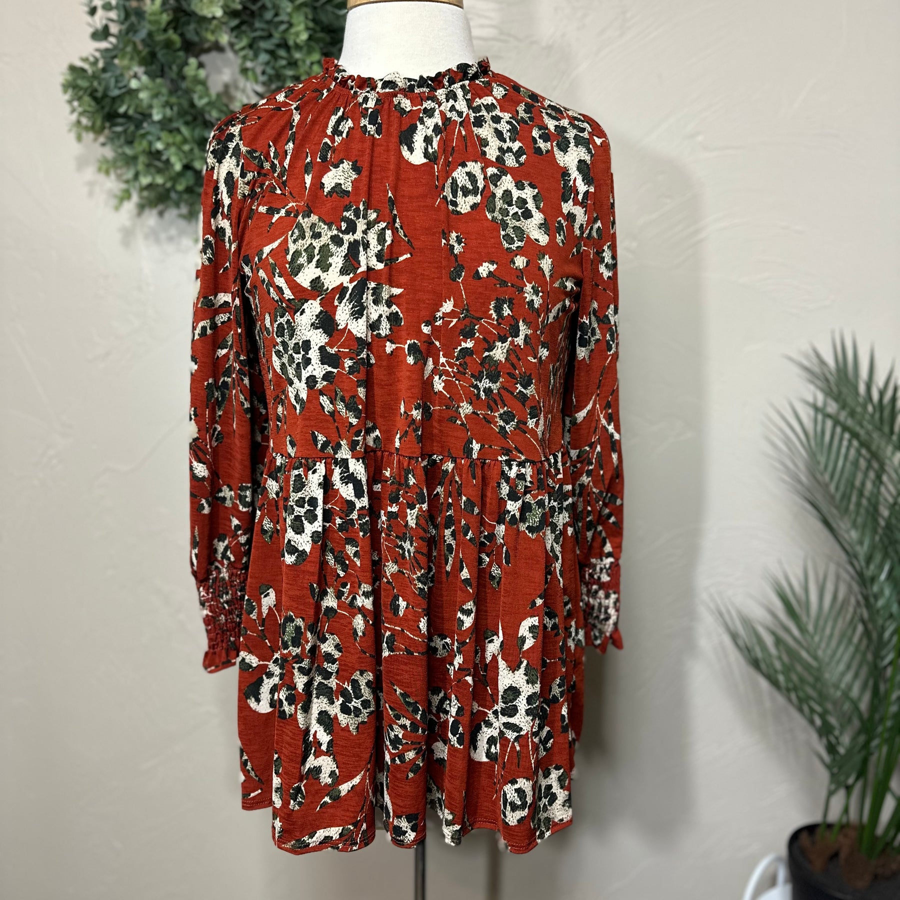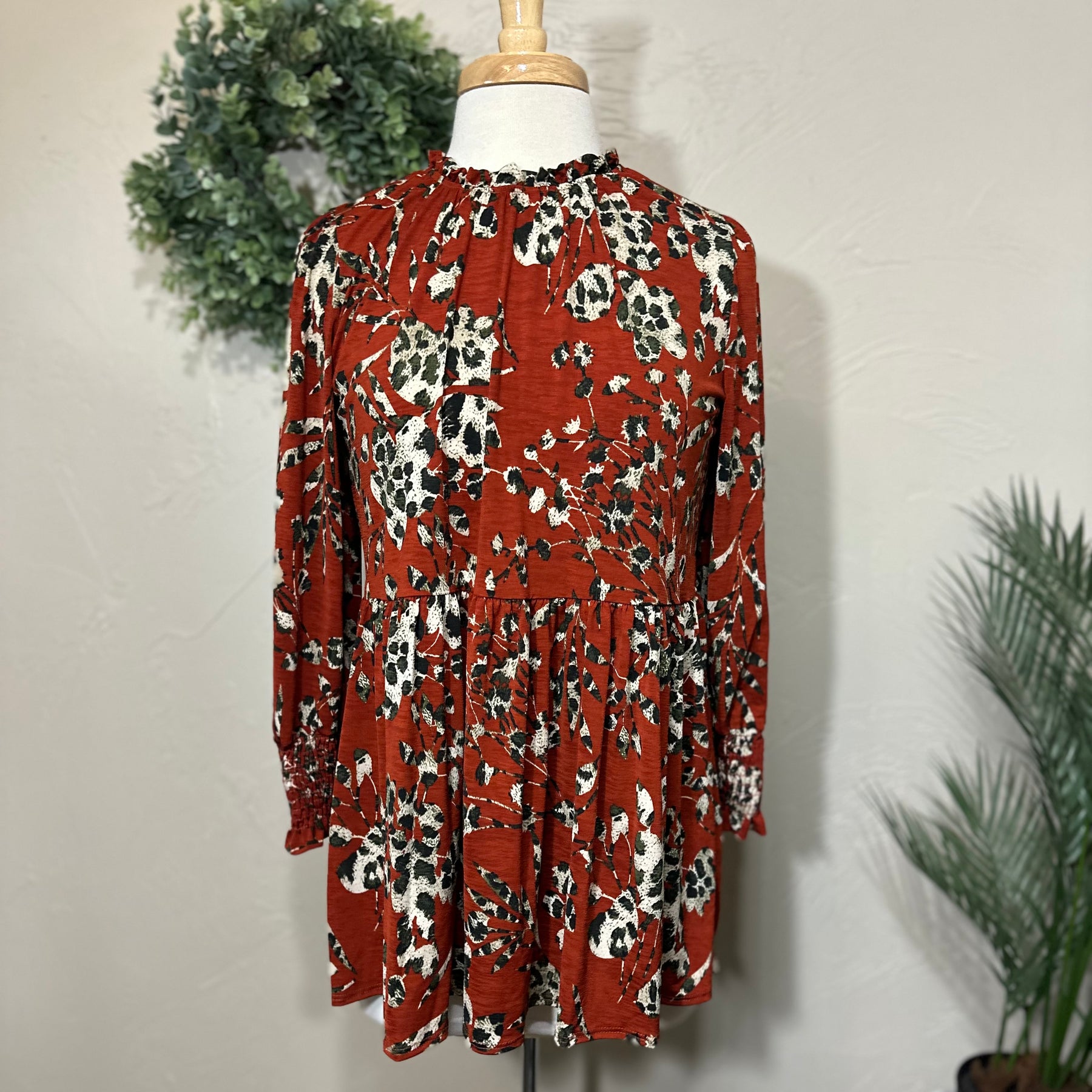 Dressy fabric and very comfortable.  Small ruffle collar, Baby doll style, stretchy fabric